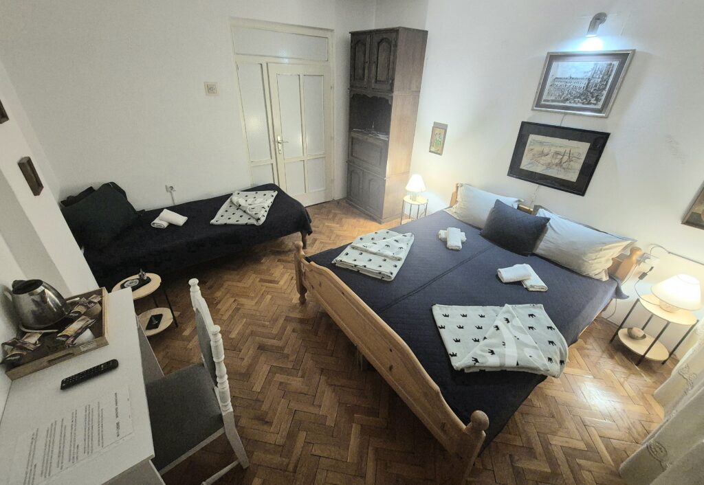 Prostrana trokrevetna soba za tri osobe, potpuno klimatizirana i pažljivo uređena za maksimalan komfor. Gostima su na raspolaganju privatna terasa i besplatan parking — idealno za miran i ugodan boravak.